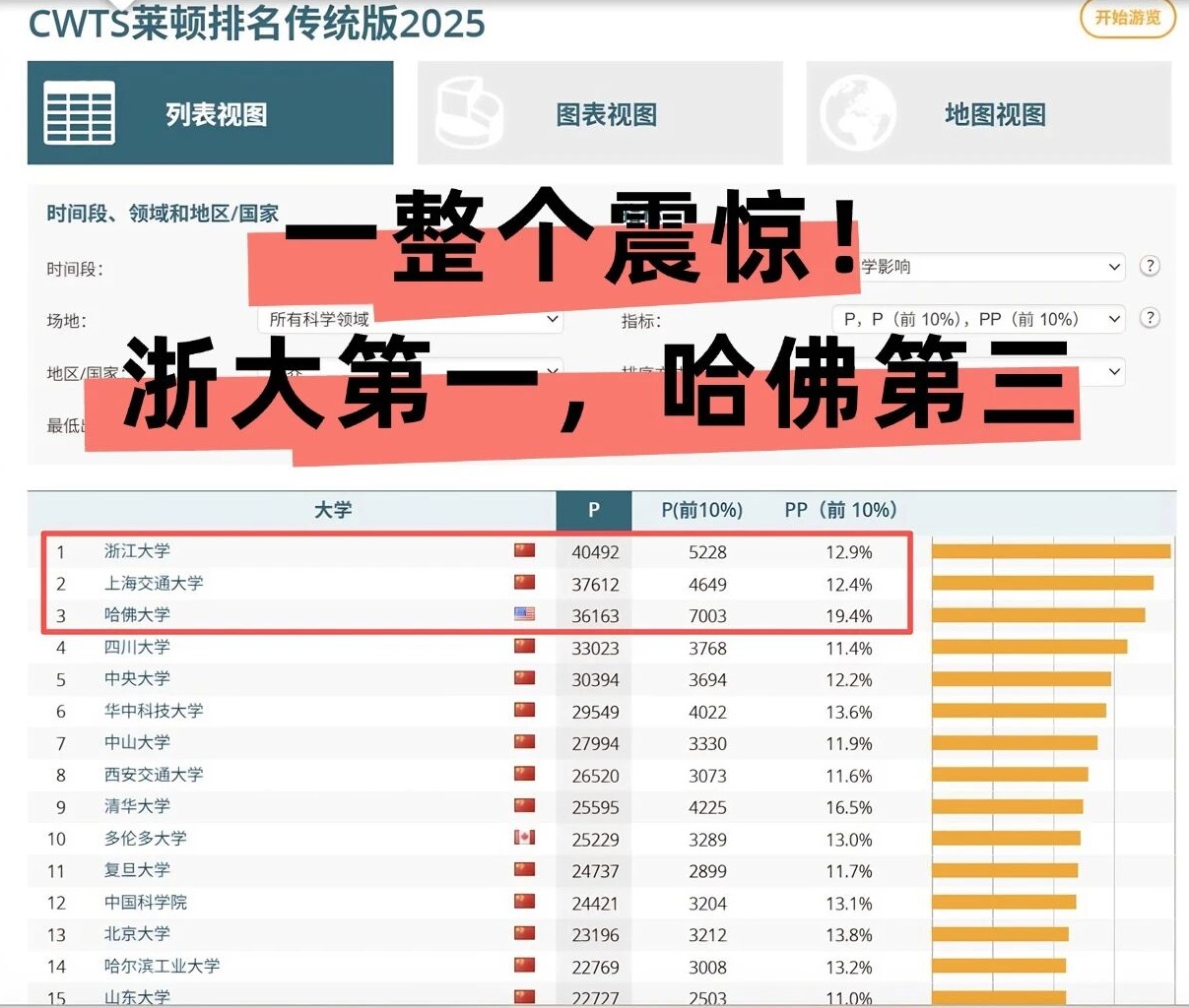 后来我仔细研究了一下,发现这是荷兰莱顿大学的CWTS排名。这个排名就像个“偏科生”,只盯着论文数量这一个指标,教学声誉啥的完全不考虑,简单粗暴得很,就是“谁论文多谁就牛”。