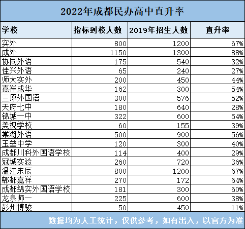 以下是统计到的目前成都各个高中初升高的直升率,根据学校2019年公布的招生人数和今年直升人数得出,有部分学校没有公布自己的招生人数,所以未统计在其中。