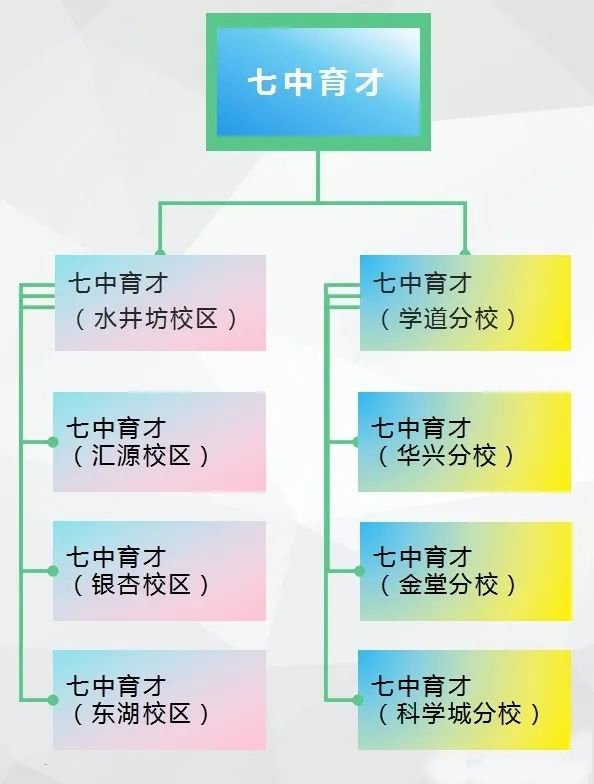图中,左边是七中育才一校四区格局,右边一列是七中育才领办学校。均为公办校。其中:
