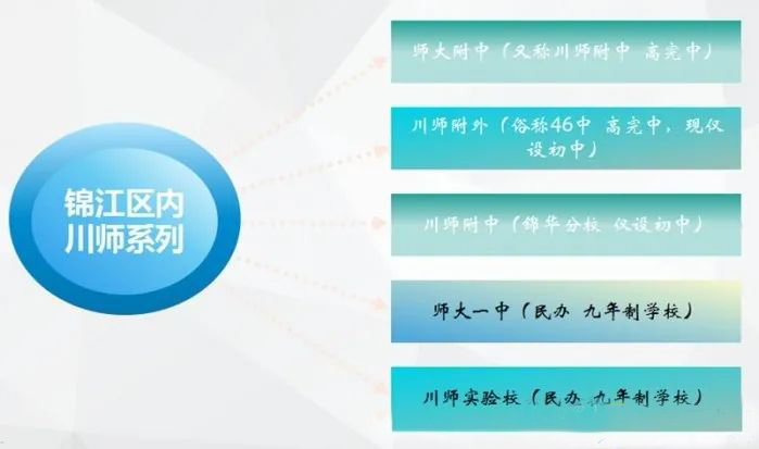 公办校:川师附中、川师附外(46中)、川师附中(锦华分校)均以多校划片招生。