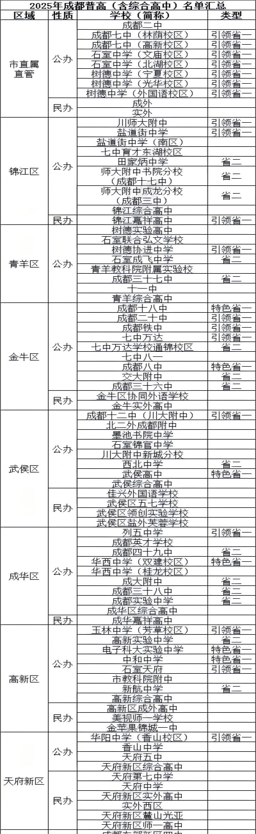 2025年成都各区域普高(含综合高中)按公办、民办分类名单汇总