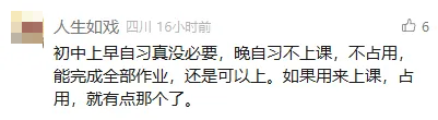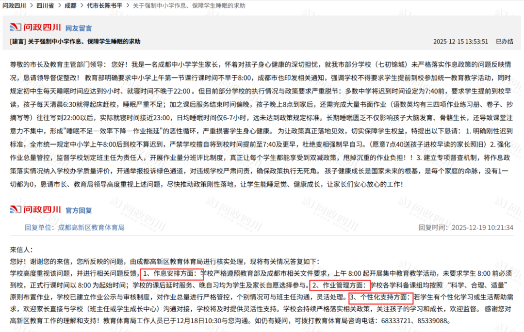 面对这样的现状,成都青羊区、锦江区、金牛区、高新区、新都区的家长们纷纷在问政平台上留言,呼吁初中生不早于8点到校的政策能够强制落地,取消早晚自习,让孩子有足够的休息时间。