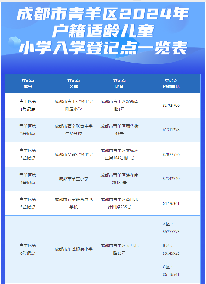2024年成都主城区户籍适龄儿童入学登记点名称及咨询电话!