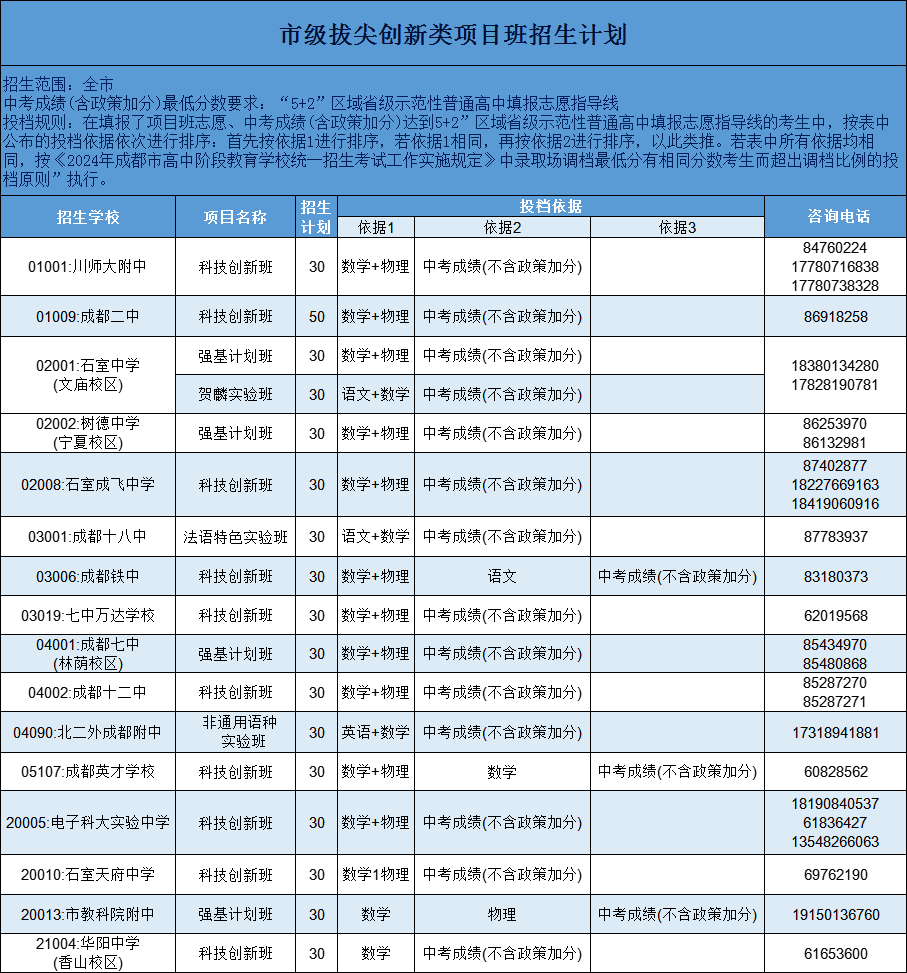 以下是成都市市级拔尖创新类项目班招生计划和成都市市级特长特色类(非艺体类)项目班招生计划汇总表,供家长参考: