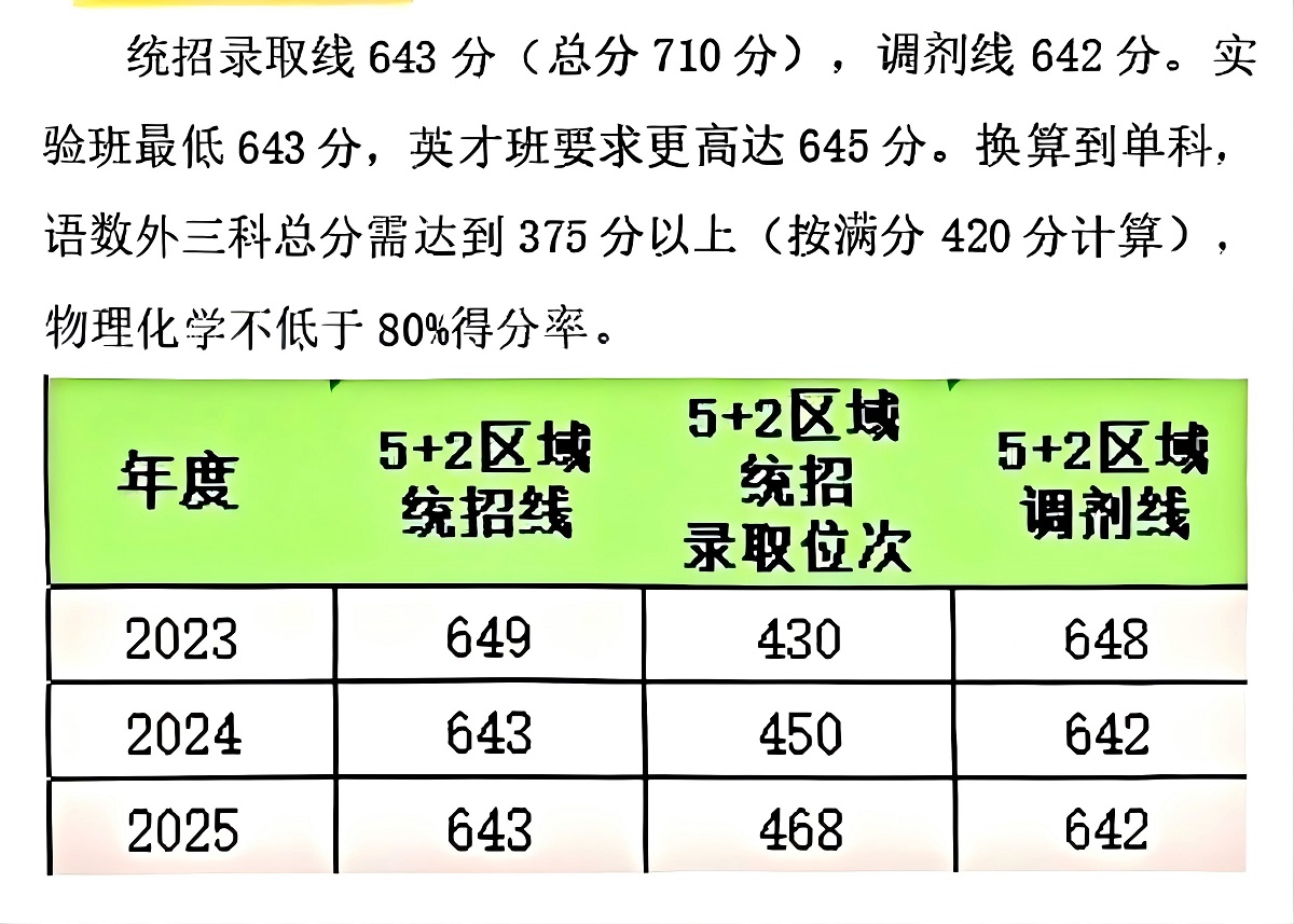 第七和第八种途径是在第二批次,面向5+2区域考生的统招和调剂招生,也是招生人数最多的方式。统招263人,调剂34人。最后实际收分线统招655分,调剂654分。这意味着,在5+2区域的六七万考生中,你得排上前500。具体到每个科目,体育要满分,小四门要拿满80分,剩下的语数外物化5科,满分570分,你只能扣55分,必须拿到515分。有三位同学25年中考分别考了656、663、676分,他们的成绩单显示,语文最高130分,其他四科几乎都是接近满分。