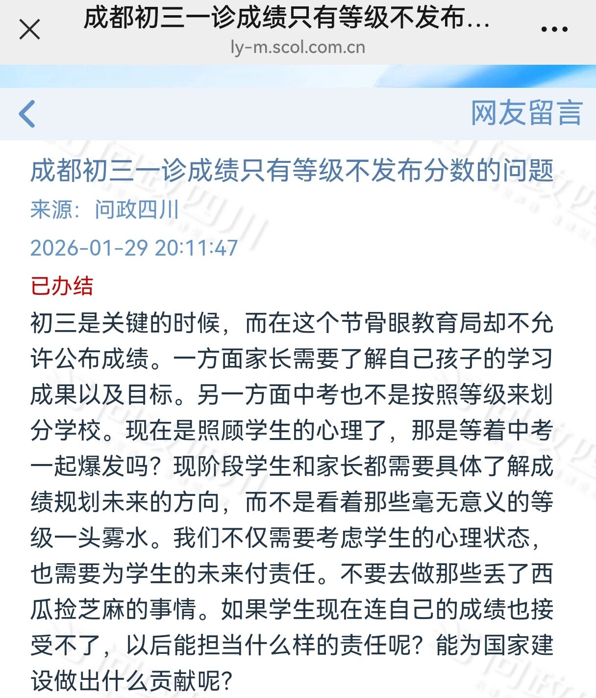 其实,期末阶段,不公布成绩、不发试卷、不展示排名,只给等级的情况并非个例,在中小学里也是普遍存在的。初三一诊成绩公布后,心急如焚的家长们多次涌入问政四川、麻辣社区等平台留言,强烈要求公开一诊分数和排名,相关留言如潮水般刷屏。