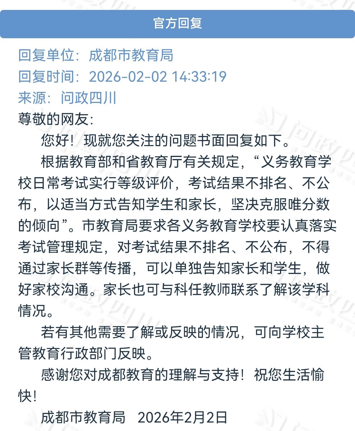 成都市教育局给出相应官方回复:依据教育部和省教育厅规定,义务教育学校日常考试实行等级评价,不排名、不公布,坚决克服唯分数倾向。同时要求学校认真落实,不得通过家长群等传播考试结果,可通过单独沟通做好家校交流,家长也能联系科任教师了解学科情况。