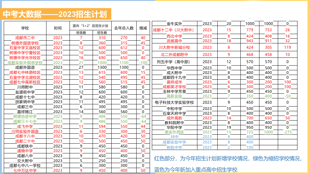 这张表为手动整理的2023招生计划,红色部分,为今年招生计划新增学校情况,绿色为缩招学校情况,蓝色为今年新加入重点高中招生学校。都在说今年学位增加了,具体增加到哪里了?如上!