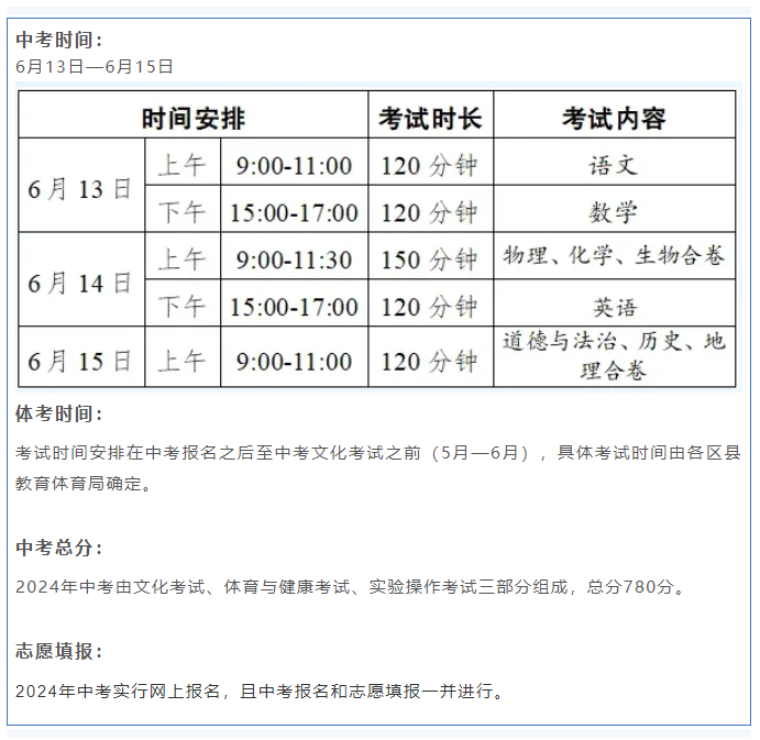 中考将至,小编特地为大家汇总了省内各地市州关于中考的核心信息,包括中考日期、体育考试安排、中考总分要求以及志愿填报时间等关键要点。快来一探究竟,为即将到来的中考做好充分准备吧!