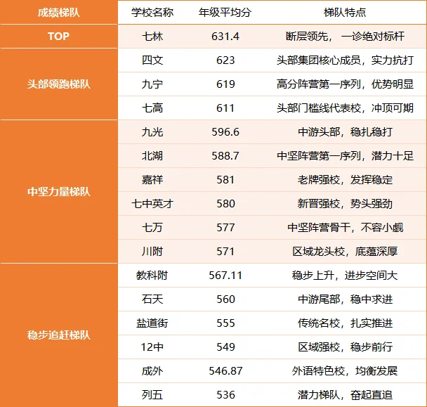 头部“TOP”梯队里,七林年级平均分631.4,远远超过其他学校,是绝对的领先者。四文是头部集团重要一员,623分的平均分实力很强。九宁619分,在高分段里排前列,优势明显。七高611分,是头部学校的门槛代表,有冲击更高成绩的可能。