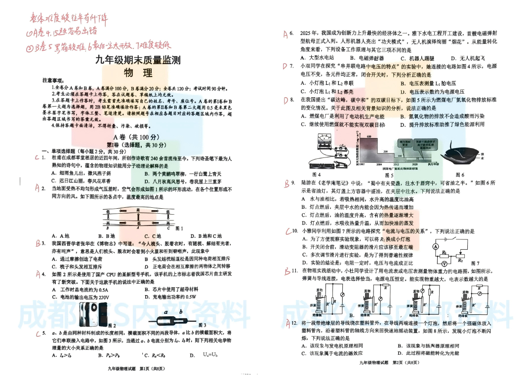 2026年青羊区初三一诊物理试卷及答案,物理真题