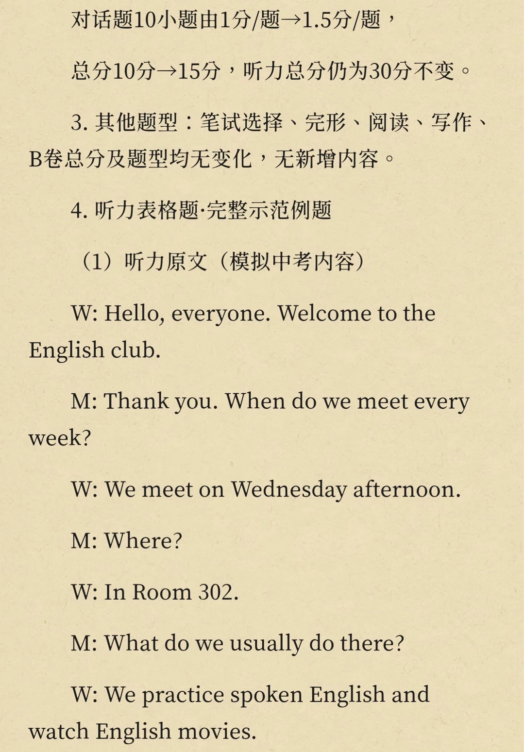 缩减的5分全部转移至听力对话题,对话题10小题由1分/题→1.5分/题总分10分→15分,听力总分仍为30分不变